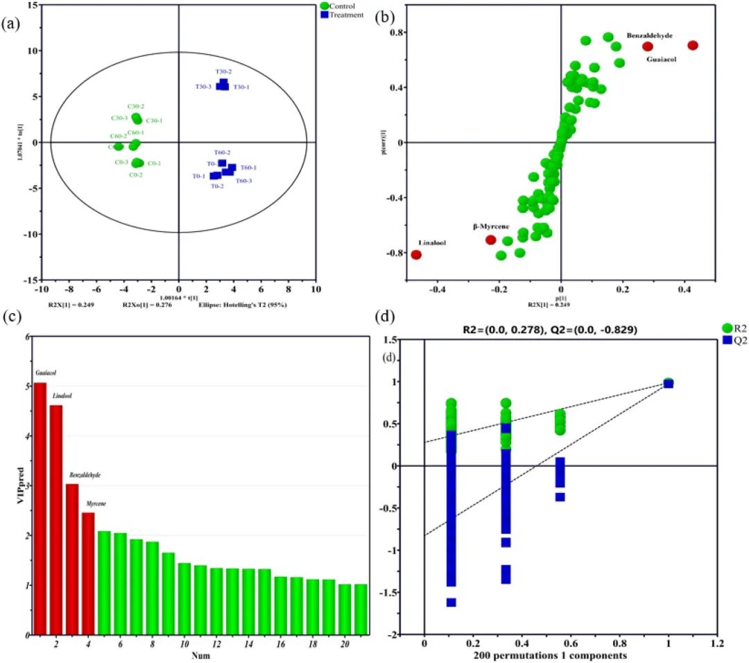 图4 两种熏肉贮存过程中挥发性风味的OPLS-DA分析(a)得分图,(b)散点图,(c)VIP图,(d)排列图