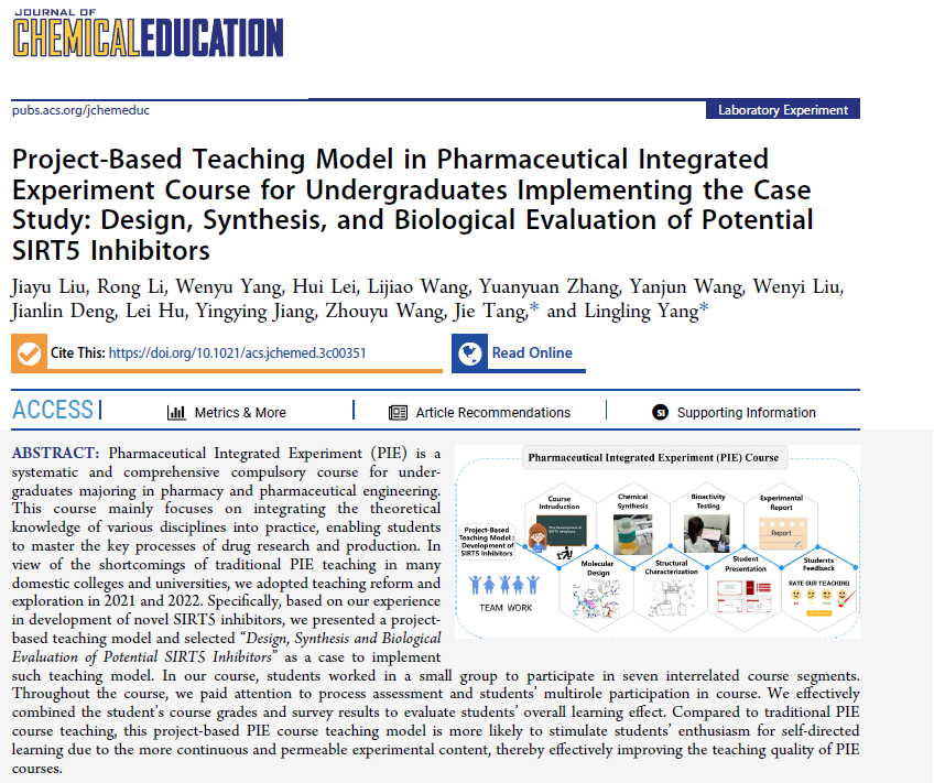 近日,食品与生物工程学院《药学综合实验》课程组在化学教育领域知名期刊Journal of Chemical Education(Q2,IF: 3.0)上发表“Project-Based Teaching Model in Pharmaceutical Integrated Experiment Course for Undergraduates Implementing the Case Study: Design, Synthesis, and Biological Evaluation of Potential SIRT5 Inhibitors.”(DOI: 10.1021/acs.jchemed.3c00351.)的教学改革论文,食品与生物工程学院杨羚羚教授和唐洁教授为通讯作者。这是一篇基于杨羚羚教授课题组新型SIRT5小分子抑制剂研究项目的创新实验课程教学模式实施案例研究与探索的论文。