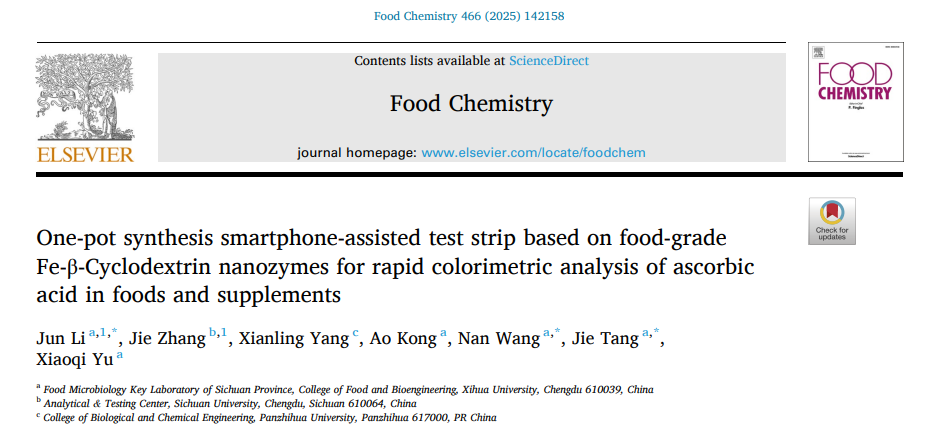 近日,食品与生物工程学院青年教师李军博士在食品国际Top期刊Food Chemistry(Q1,IF: 8.5)发表题为“One-pot synthesis smartphone-assisted test strip based on food-grade Fe-β-Cyclodextrin nanozymes for rapid colorimetric analysis of ascorbic acid in foods and supplements”的研究论文。李军博士为该论文的第一作者及通讯作者,王楠博士和唐洁教授为共同通讯作者,四川大学张杰副研究员为论文的共同第一作者,西华大学为第一通讯单位,余孝其教授等老师为本研究工作提供了重要指导和帮助。