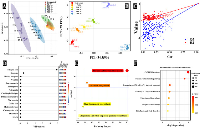 Fig. 3. A: PCA score plot of phenolic compounds in RO under various microwave power and storage time. B: PLS-DA score plot of phenolic compounds in RO under various microwave powers. C: Permutation test plot. D: VIP score plot of phenolic compounds in RO under various microwave powers. E: Metabolic pathway analysis of phenolic compounds in RO samples. F: Pathway enrichment analysis of phenolic compounds in RO samples.