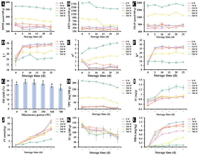 Fig. 4. Changes in physicochemical characteristics of RO under various microwave power and storage time. A-C represent changes in the radical scavenging ac tivities of DPPH , and FRAP, respectively. D F represent changes in lightness (L*), redness (a*), and yellowness (b*) of RO, respectively. G: Effects of microwave power on the oil yield of RO. H: Effects of microwave power and storage time on TPC of RO. Results were expressed as mean values of three repetitions, and different letters in bar chart represent significant differences (p < 0.05). I-L represent changes in the AV, PV, IV, and MDA content of RO, respectively.