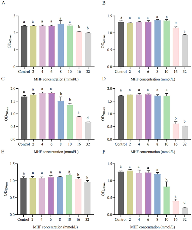 图3 不同MHF浓度对(A)植物乳杆菌、(B)阴沟肠杆菌、(C)特雷维桑克氏菌、(D)尤因氏假单胞菌、(E)毕赤酵母属以及(F)热带假丝酵母生长的影响