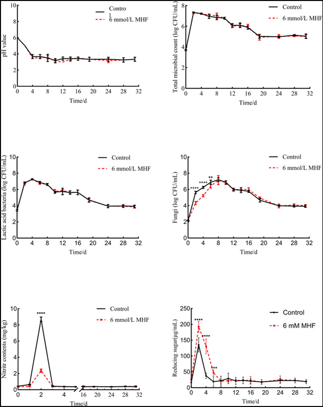 图6 泡菜发酵过程中,MHF组和对照组的(A)pH 值、(B)微生物总数、(C)乳酸菌(LAB)、(D)真菌、(E)亚硝酸盐含量以及(F)还原糖水平的变化