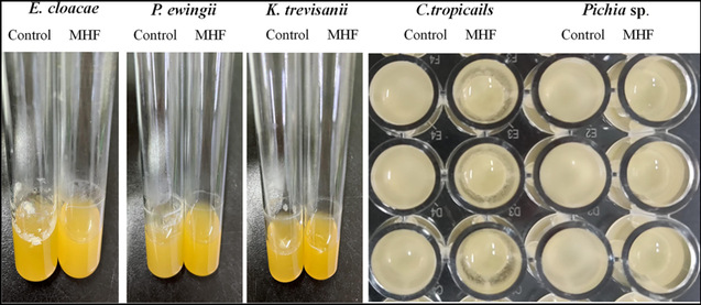 图4 MHF对阴沟肠杆菌、尤因氏假单胞菌、特雷维桑克雷伯菌、热带假丝酵母和毕赤酵母属生物膜形成的影响