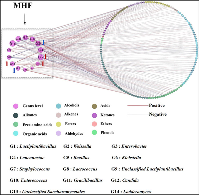 图11 发酵豇豆在前 31 天内微生物与风味物质之间的相关性网络分析