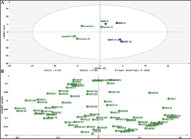 图10 正交偏最小二乘判别分析OPLS-DA得分图及其S-plot图