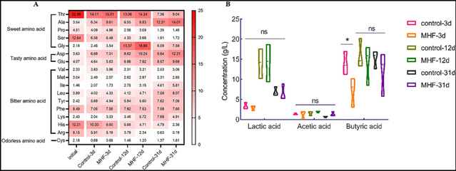 图9 对照组和 MHF 组发酵过程中(A)FAA 和(B)有机酸含量的变化