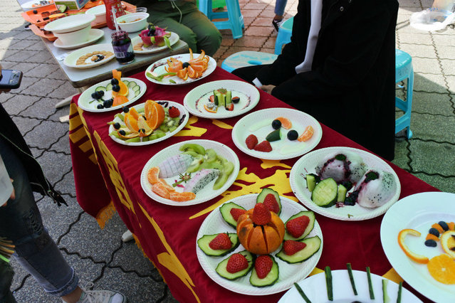 第二部分线下活动“水果拼盘”和“美食游园会”于41日在明德广场开展。水果拼盘中,各小组通过相互协作,将不同造型和颜色的水果经雕刻、拼凑、融合,创造出形态各异、色彩缤纷的艺术品;美食游园会设置有“以食会友”、“美食大问答”、“水瓶挑战”、“酸甜苦辣”、“美食套圈”等趣味活动,吸引大量同学热情参与,同学们在享受活动乐趣的同时,也能学习相关美食知识。现场热闹非凡,同学们玩得不亦乐乎。