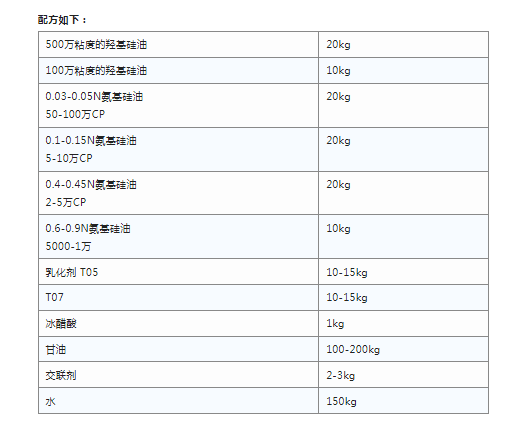 将配方中的各种氨基硅油和羟基硅油加入到带有高速分散、刮壁装置的乳化釜中,高速搅拌2小时,物料温度会迅速升温,温度会达到90℃左右。此时,氨基硅油与羟基硅油会有反应,重新分布结构,氨基硅油中的氨基会转移至羟基硅油中,羟基硅油的羟基有部分与氨基结合。物料混合降解后,降温至40℃以下,加入交联剂,加入乳化剂,搅拌10-20分钟,将1kg冰醋酸加到10kg的水中,即所说的酸水,慢慢加到乳化釜中,搅拌10-20分钟,再将甘油分次分批加入,再将水慢慢加入。静止、过滤、包装。