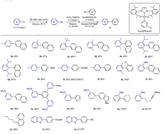 通过上述方法制备的有机钠化合物可以用zncl2•tmeda(比zncl2对水汽稳定)进行转金属化得到有机锌试剂,这样要比通过溴代物或碘代物去制备成本低很多,操作也更方便。后者在valente等人开发的催化剂pd-peppsi-ipr催化下可进一步与另一分子的芳基氯代物发生negishi偶联。这种方法可以实现大位阻双芳基化合物的“一锅法”合成(3b-3g),反应对芳基氯代物的电子特性没有特别的要求(3j、3o、3p和3s);敏感的官能团如烷氧基羰基(3i、3p、3t)或氰基(3u)都能很好地与反应兼容。该反应的转化数可高达920(0.1 mol%的催化剂,以92%的收率得到3i),甚至还能以克量级规模合成(如3i)。烷基氯代物(3r、3s)和烯基氯代物(3q)也能参与反应。值得一提的是,芳香杂环类底物如苯并呋喃和苯并噻吩可以在natmp(tmp:2,2,6,6-四甲基哌啶)作用下直接去质子化得到相应的芳基钠化合物,进而发生negishi反应(3t、3u)。