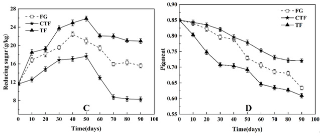 Fig. 2. Changes of physicochemical factors during PBP fermentation inthe three processes. (A)Total titratable acidity; (B) Amino type nitrogen; (C) Reducing sugars and (D) Pigment.