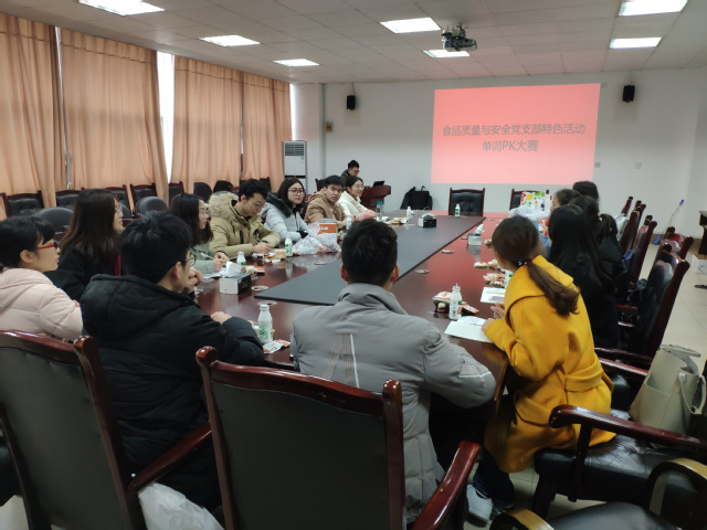 食品与生物工程学院食品质量与安全专业学生党支部坚持以习近平新时代中国特色社会主义思想为指导,认真贯彻落实新时代党的组织路线,不断提高党支部建设质量,不断探索创新支部工作方式。1月3日中午,食品质量与安全专业党支部于5D419进行了创新党支部活动“单词比拼大赛”。赛事由支部同志姚博、胡家艺、吴胜勇三位同志主持,陈锦老师担任比赛嘉宾,支部全体成员为参赛选手。