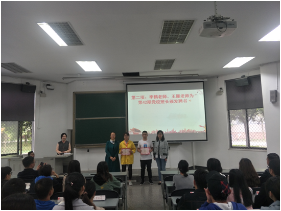 庄严地合唱国歌后,李鹤书记,王雁老师为党校班长们颁发了聘书,随后党校班长陈强强调了党课的纪律要求。学员代表张玉玲代表学员们承诺,在接下来的党校和日常学习生活中,会认真学习、遵守纪律、严格要求自己。最后,李鹤书记做了重要讲话。她总结了前期推优以及党校学员筛优工作,并对本期学员提出了要求和期待。希望每位学员能端正入党动机,认真学习党的理论知识,用党员的标准鞭策自己,不断提高自身的思想觉悟,学有所得勇于争先,在同学中起到表率作用。