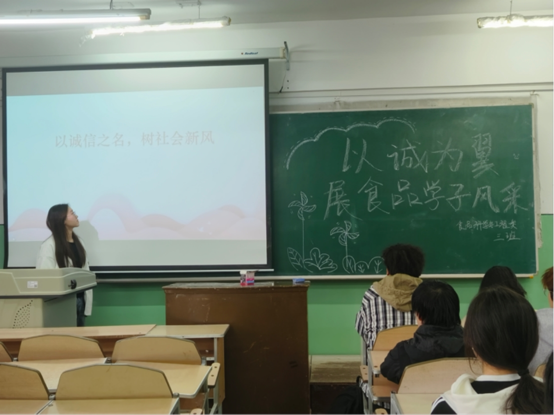 为弘扬中华民族传统美德,扎实推进社会主义核心价值观教育,强化学生诚信意识,营造诚信为本的校园文化氛围。贯彻执行学校2024年诚信文化建设工作部署要求,食品工程学院于2024年5月11日开展“以诚为翼,展食品学子风采”主题班会。以引导青年学生树立正确的人生观和价值观,强化学生诚信意识,弘扬崇尚诚信的校园文化,扩大诚信教育覆盖面。