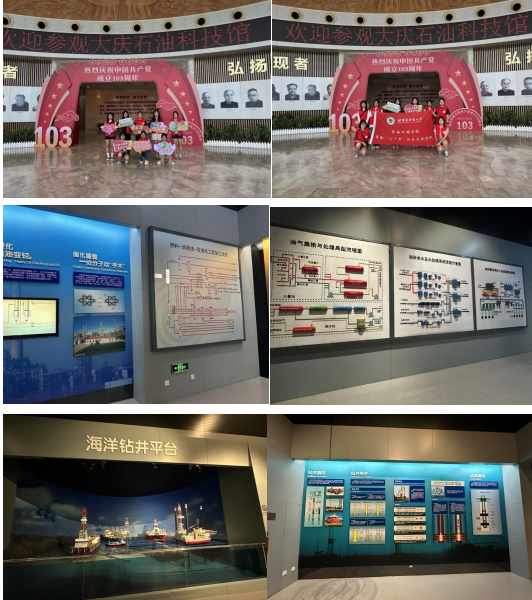 团队成员共同走进大庆石油科技馆,了解石油勘探的技术与发展。通过展出的珍贵文物、模型以及场馆的多媒体,同学们了解到中国乃至世界石油工业的发展历程。从早期的钻井技术到现代化的开采设备,同学们能够看到石油勘探和生产技术的不断进步和发展。并在互动体验区亲身体验模拟场景和技术演示,进一步加深对石油勘探开采科技的认识与理解。通过参观科技馆中的陈列和聆听讲解员的介绍,成员们更全面地认识到大庆油田的历史背景、勘探过程、生产工艺以及环境保护等方面的内容。提升了同学们的科学素养,也更加明确了扎实学好专业知识,实现科技报国的理想。